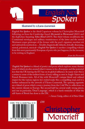 English Not Spoken is the third Caparison volume by Christopher Moncrieff. It recalibrates the Continental travelogue, military reminiscences and surreal Mortmere-esque grotesque of Moncrieff’s two previous Caparison volumes, with the poet’s signature mordant wit and satirical deconstruction.