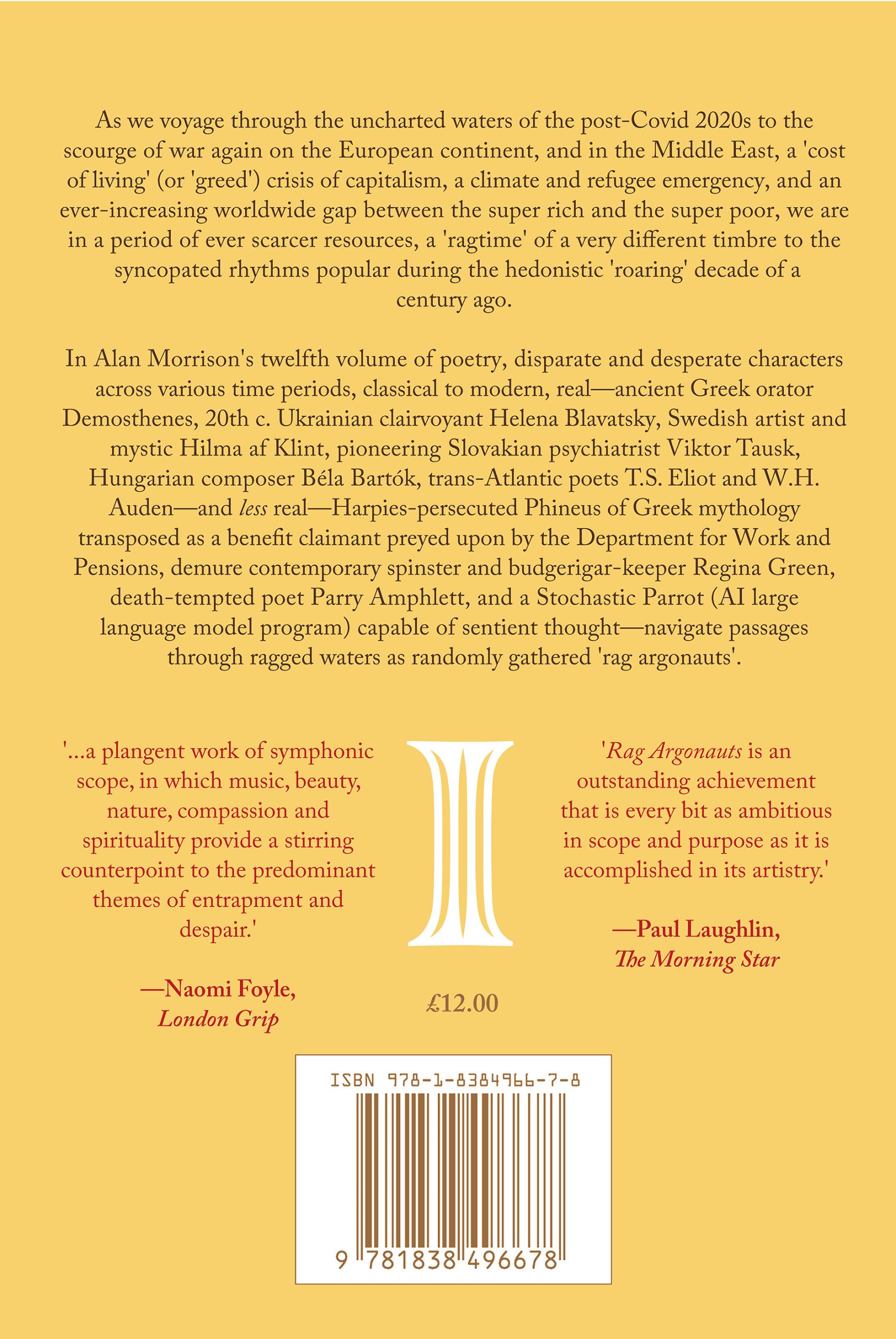 Alan Morrison’s twelfth full volume of poetry. As we voyage through the uncharted waters of the post-Covid 2020s to the scourge of war again on the European continent, and in the Middle East, a ‘cost of living’ (or ‘greed’) crisis of capitalism, a climate and refugee emergency, and an ever-increasing worldwide gap between the super rich and the super poor, we are in a period of ever scarcer resources, a ‘ragtime’ of a very different timbre to the syncopated rhythms popular during the hedonistic ‘roaring’ decade of a century ago.